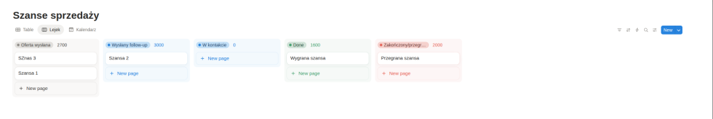Oczywiście nie będę tutaj pokazywał całej konfiguracji Notiona, bo to jest potężne narzędzie i trzeba je dostosować do potrzeb firmy. W końcu nie ma uniwersalnego procesu i każdy ma swój sposób, na którym działa i jest w jego firmie sprawdzony. Notion umożliwia zwizualizować Twój proces w formie kalendarza, listy zadań czy takiego lejka.